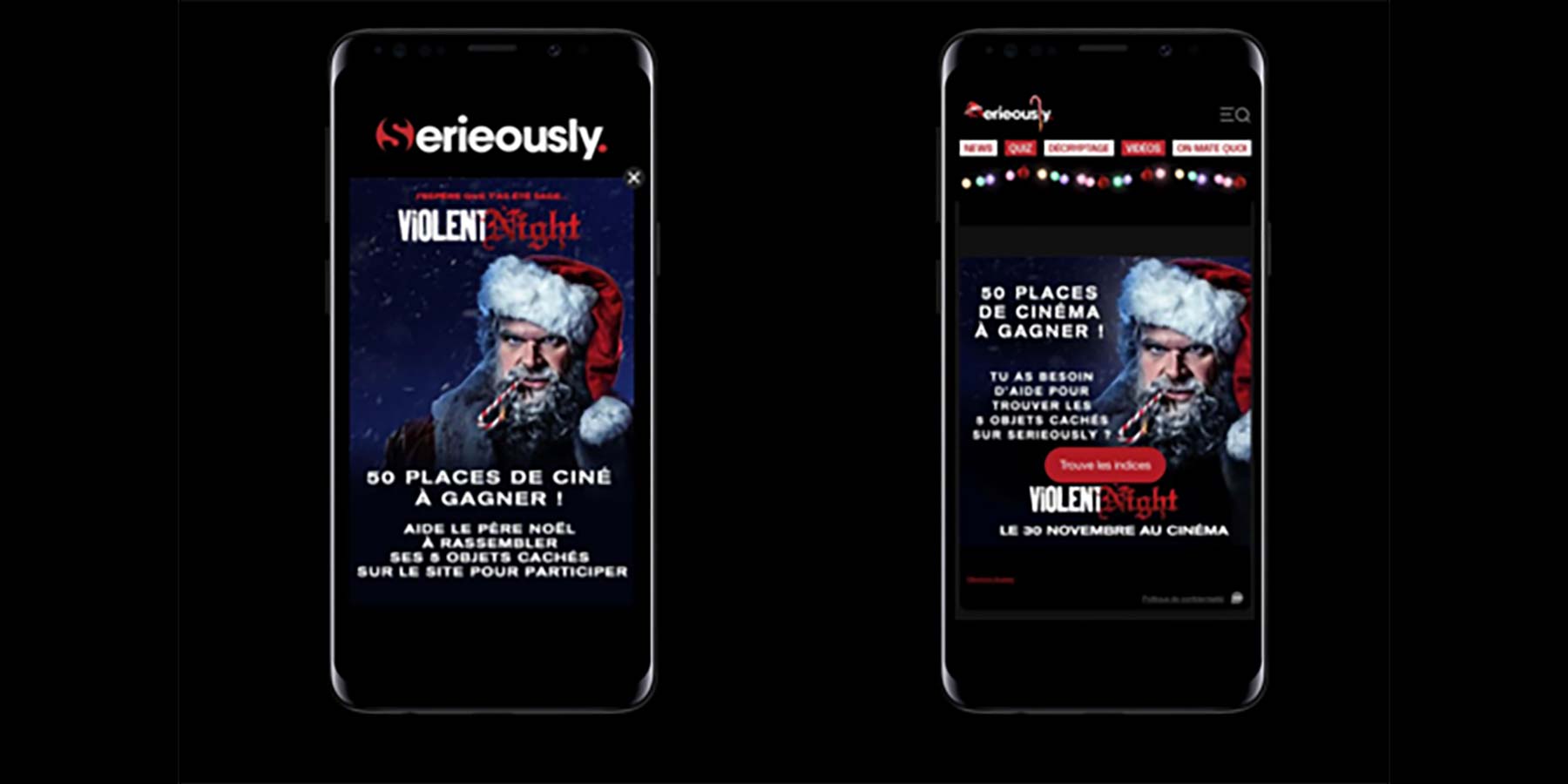 A l’occasion de la sortie de Violent Night en salles, Universal Pictures nous a sollicité pour une campagne évènementielle. Chasse au trésor exclusive sur le site pour gagner des places de cinéma et compte à rebours sur la phase teasing, complétés par un take-over sur le site le jour de sortie avec notre aux couleurs du film, enfin une campagne display percutante axée sur les moviegoers.